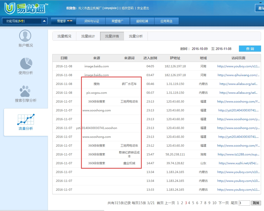 鑫業(yè)機械關(guān)鍵詞與流量分析4(如上圖)【每天哪個搜索引擎、多少人搜索、哪的客戶搜索】