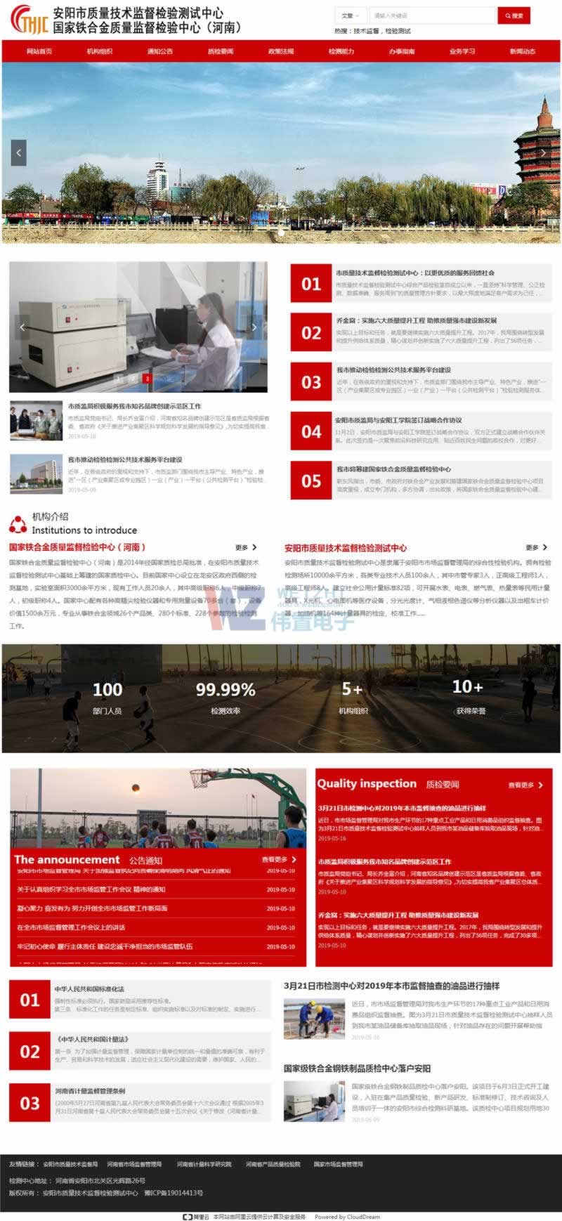 某某質(zhì)量技術(shù)監(jiān)督檢驗測試中心的網(wǎng)站制作的目的主要是以展示型為主。網(wǎng)站主要以紅為主色調(diào),色彩搭配和諧。網(wǎng)站突出展示了機構(gòu)組織、通知公告、檢測能力、辦事指南等等內(nèi)容。