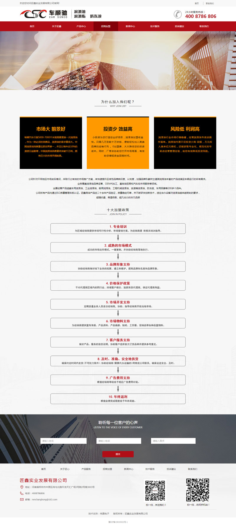 頁面簡潔大方,網(wǎng)站以紅、黑、白為主色調,色彩搭配協(xié)調,更能突出重點。招商加盟欄目以單頁的形式展示,內容豐富,更能吸引客戶。