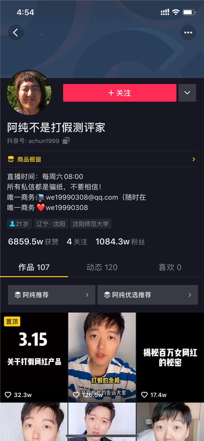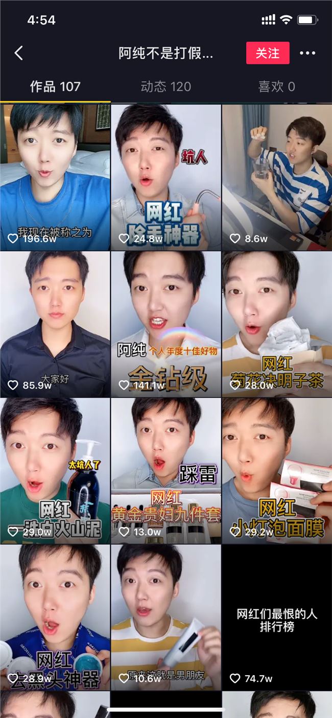 阿純其實(shí)很聰明,建立了兩個(gè)賬號(hào):一個(gè)賬號(hào)打假測(cè)評(píng),樹立人設(shè);一個(gè)賬號(hào)變裝獵奇,積累粉絲,為自己的另一個(gè)賬號(hào)引流。
