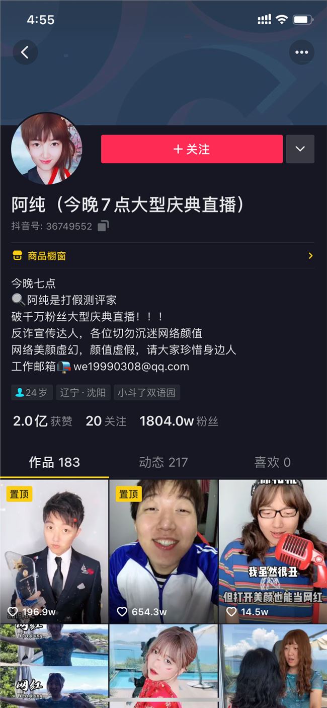 這個(gè)賬號(hào)主要更新的是阿純換裝的視頻,身高近 190 的阿純?cè)诜b和濾鏡等工具的作用下,秒變“小女生”,巨大的反差斬獲了大量粉絲,截至目前這個(gè)賬號(hào)的粉絲數(shù)達(dá)到了 1800 萬(wàn)+。