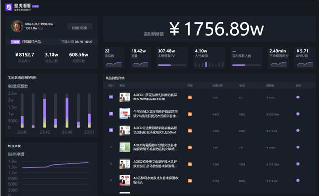 8 月 29 日,阿純的直播GMV達(dá)到了1756. 89 萬(wàn)。其中單價(jià)達(dá)到 419 的肌底液,單品GMV就達(dá)到了229. 7 萬(wàn)。單價(jià) 69 元的洗面奶銷量達(dá)到了 5 萬(wàn)件!